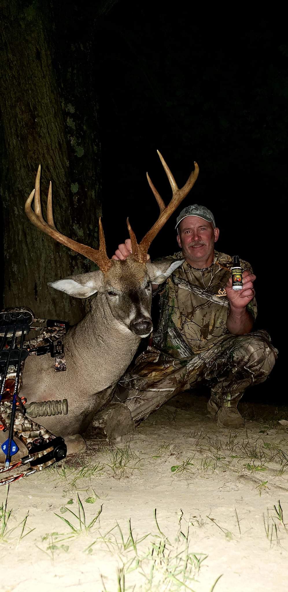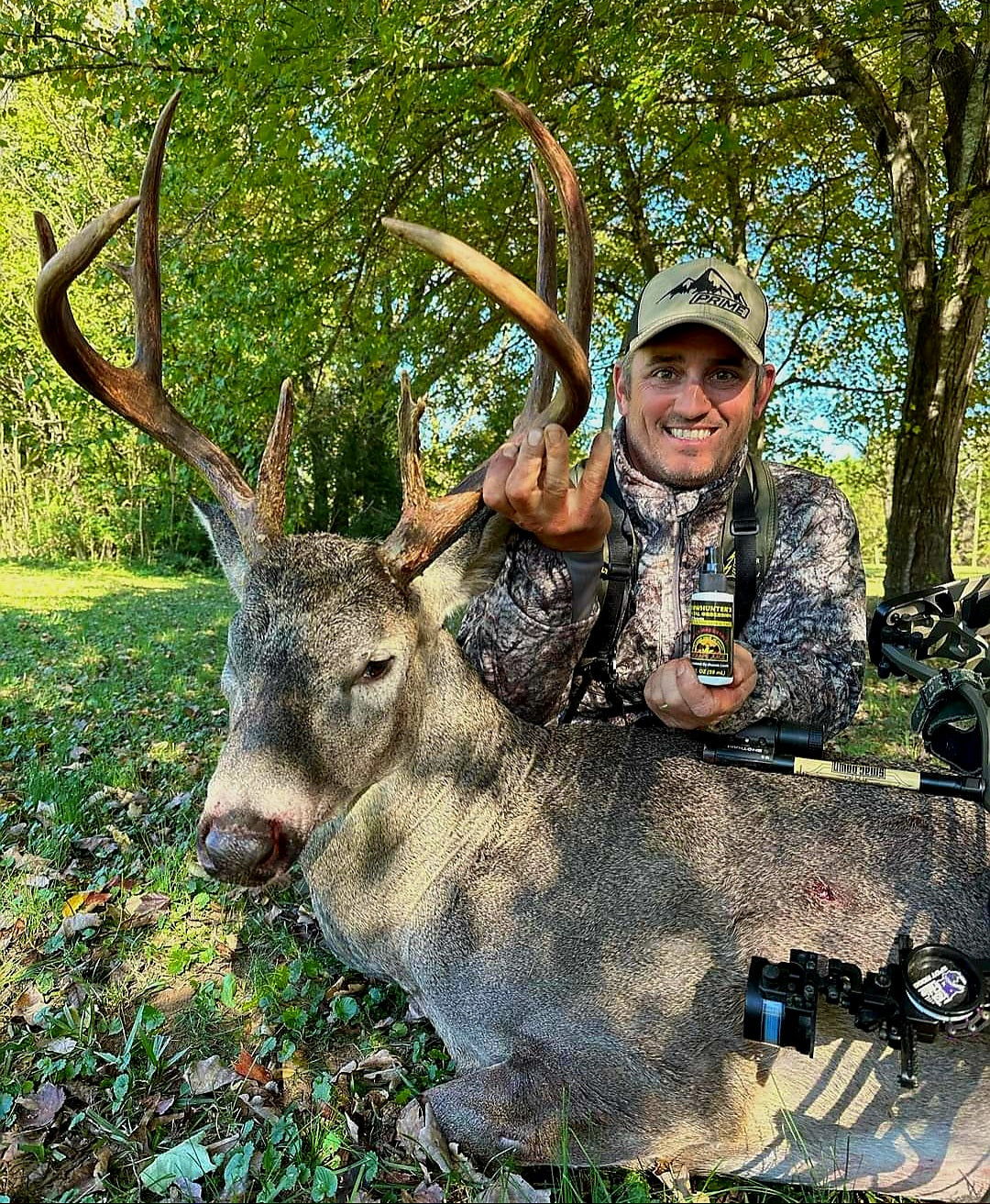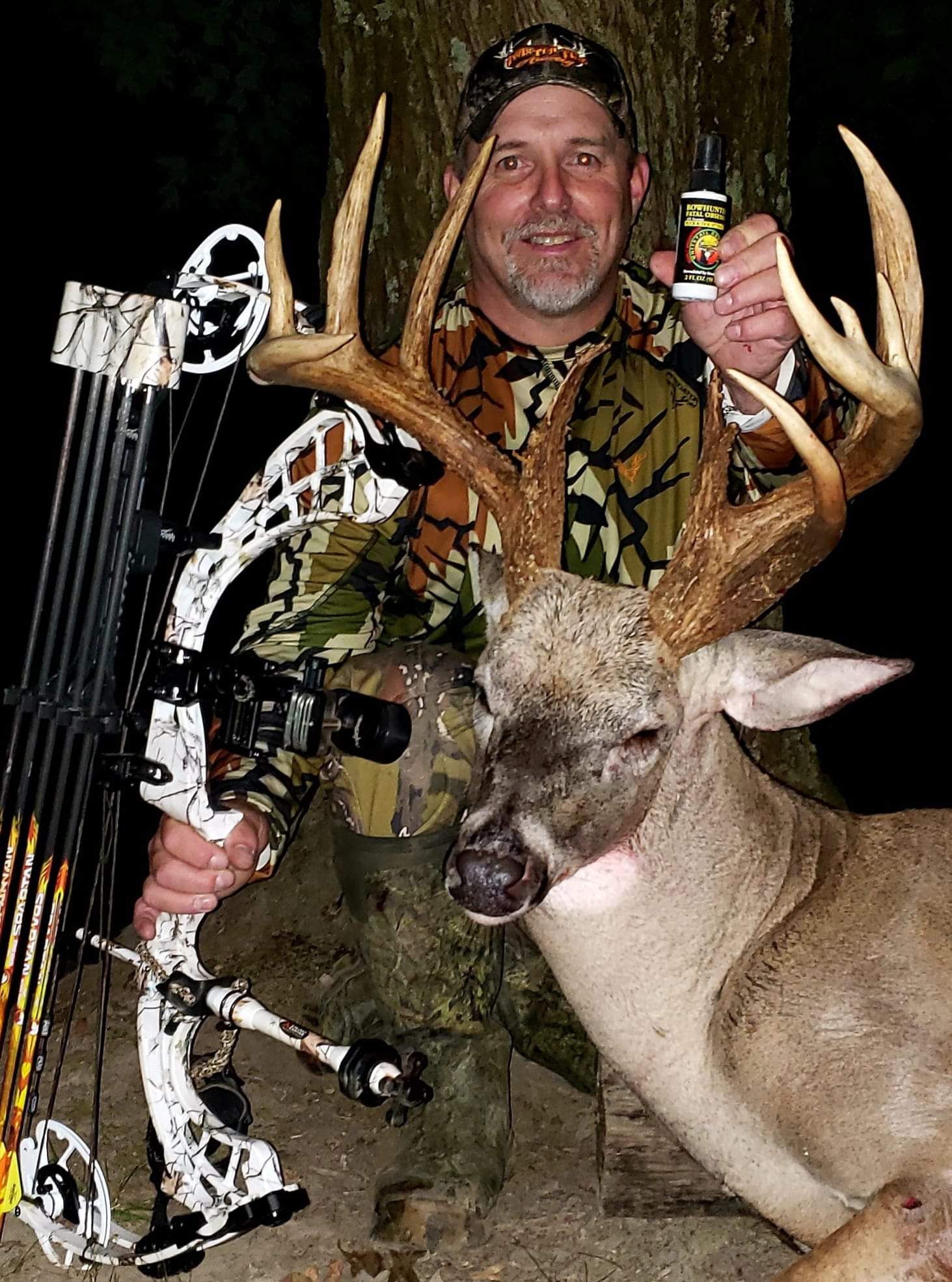 Pro-Staffer, Curtis Kitchens, With his Buck. He nabbed this high grossing whitetail buck using our brand new attractant, X-Rate Tarsal Juice, A carefully crafted blend of territorial tarsal glands and doe estrus, formulated to attract large bucks to close range, Perfect for the seasoned bowhunter.