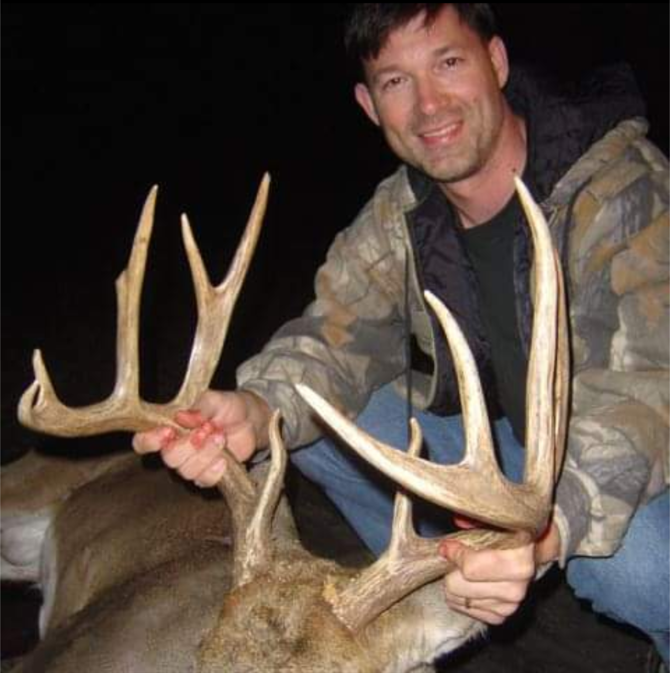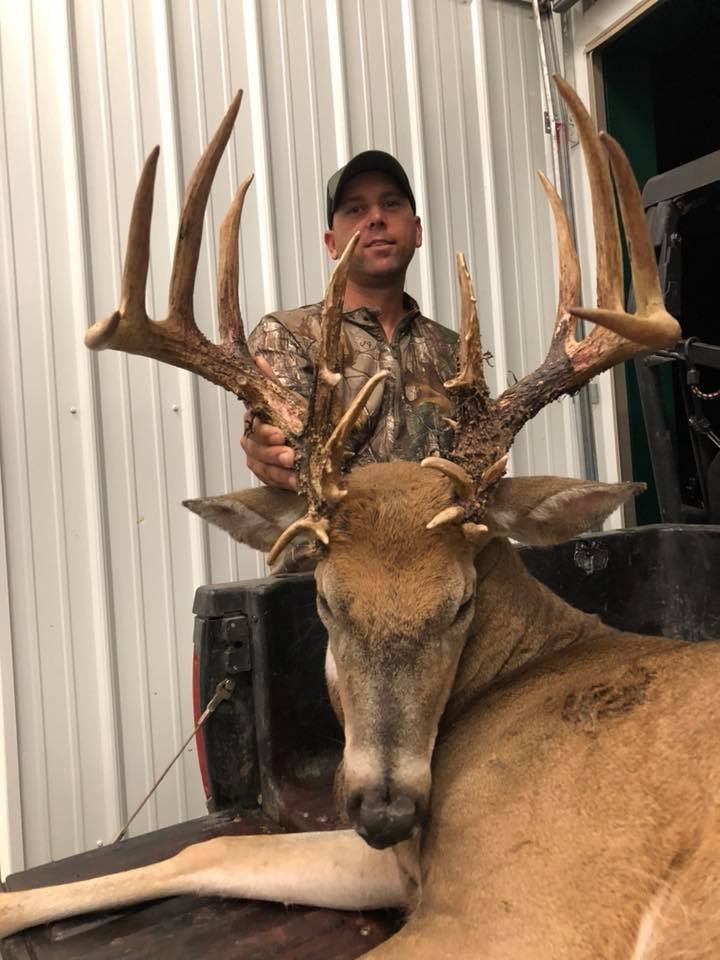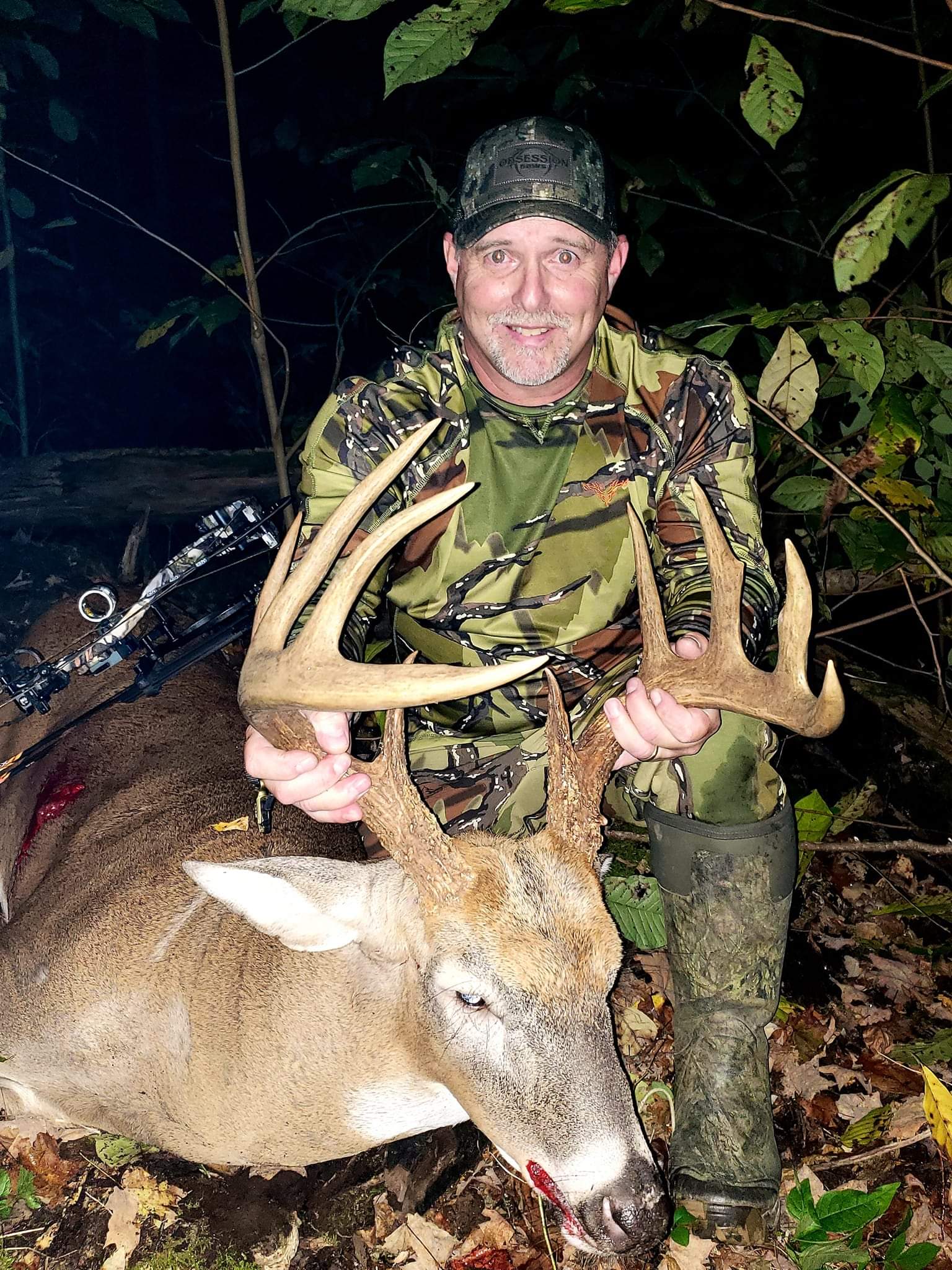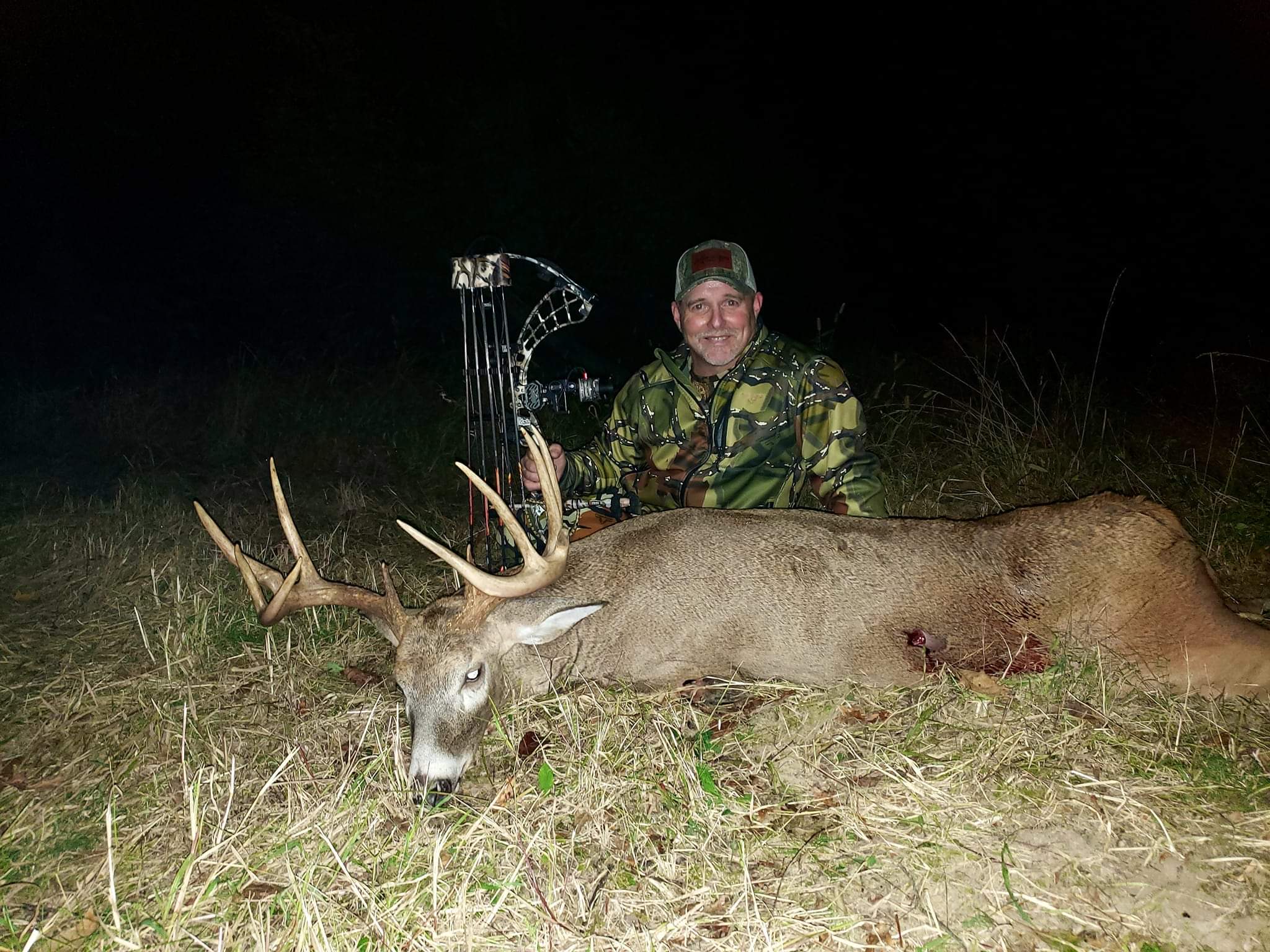 Pro-Staffer, Curtis Kitchens, With his Buck. He nabbed this high grossing whitetail buck using our brand new attractant, X-Rate Tarsal Juice, A carefully crafted blend of territorial tarsal glands and doe estrus, formulated to attract large bucks to close range, Perfect for the seasoned bowhunter.